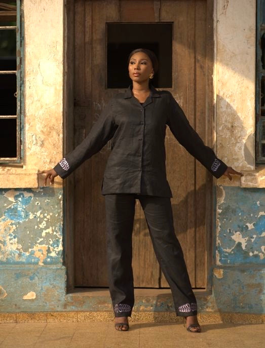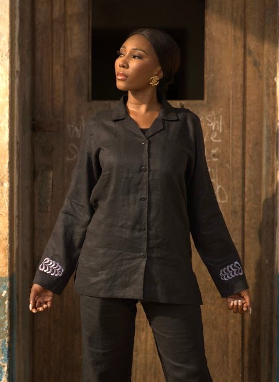 Shirt and Pants embroidered with Adinkra Symbol Aya, a fern that can grow in difficult places. This symbolizes endurance, resourcefulness, and defiance