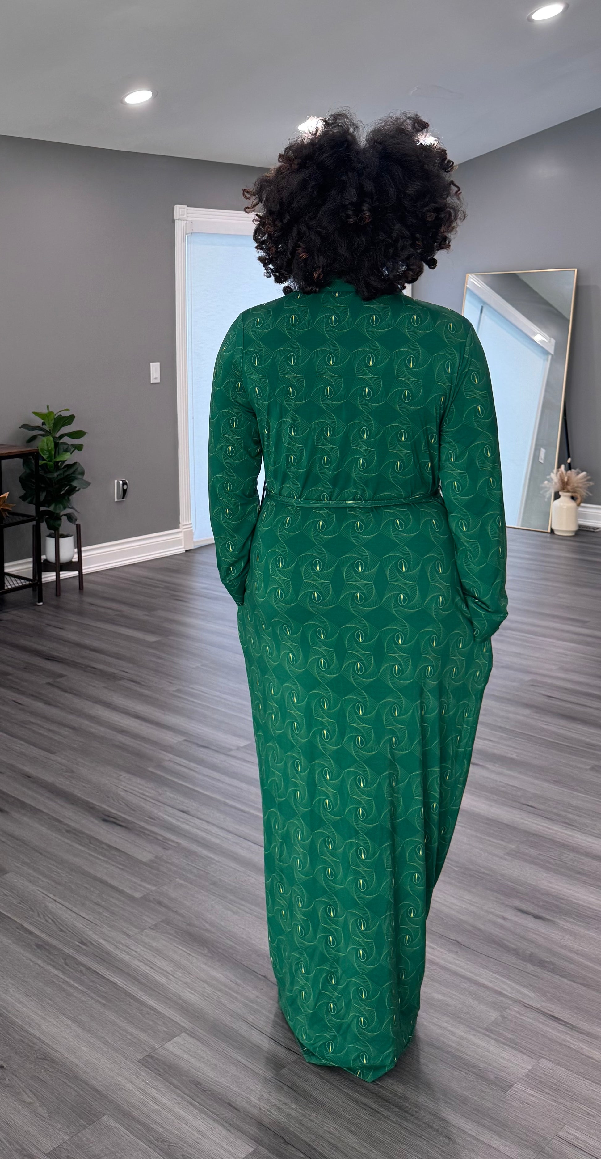 The symbols in the Layaa Robe design signifies dark green background symbolizing the rich green land in africa , cowries in gold symbolizing the wealth, prosperity, fertility and power in many african cultures and gold geometric patterns symbolizing the cycle of wealth and richness of the african culture.