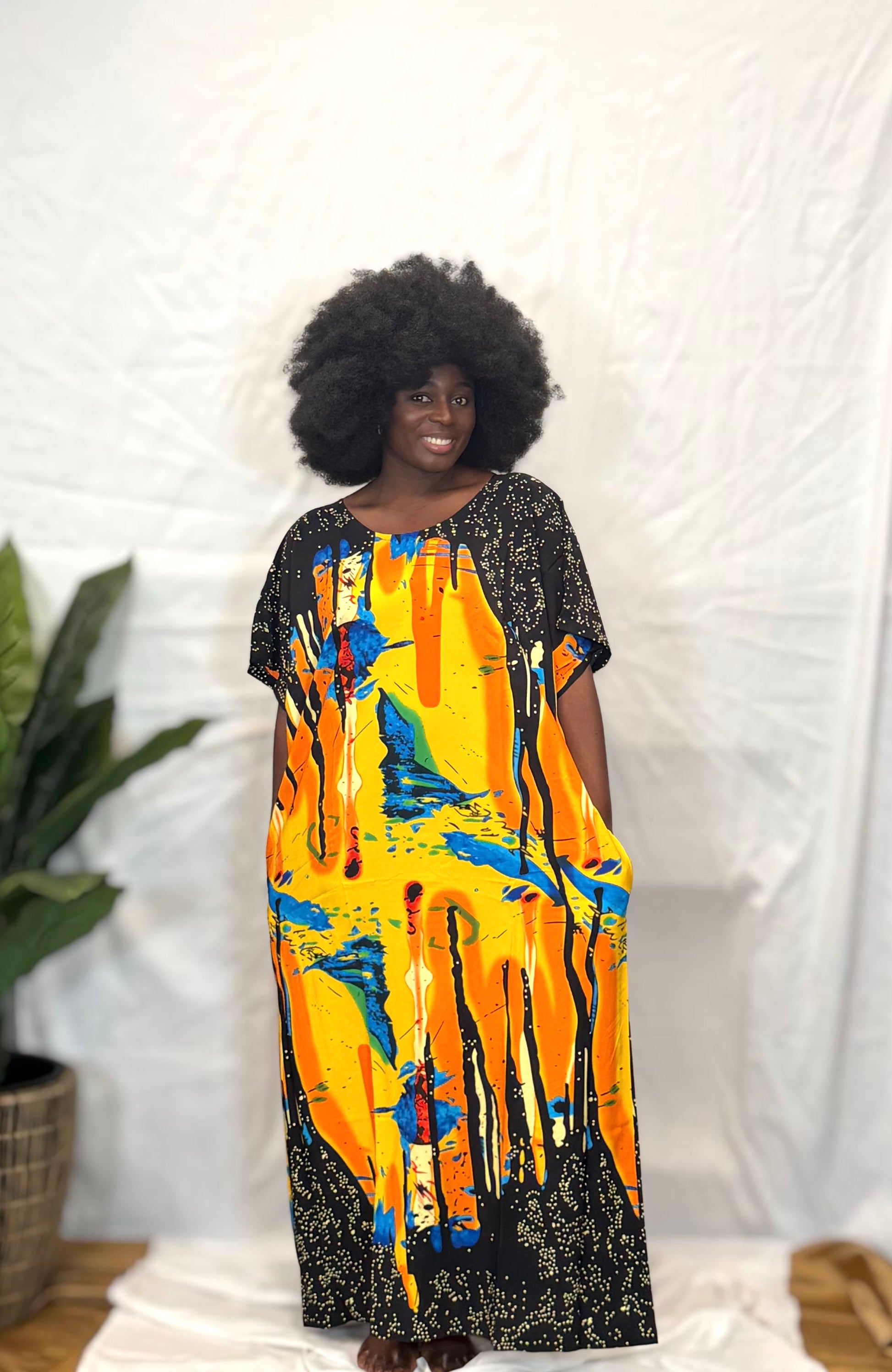Model wears dress size M/L and is wearing S-L in the kaftan dress shown. Model is 5’10